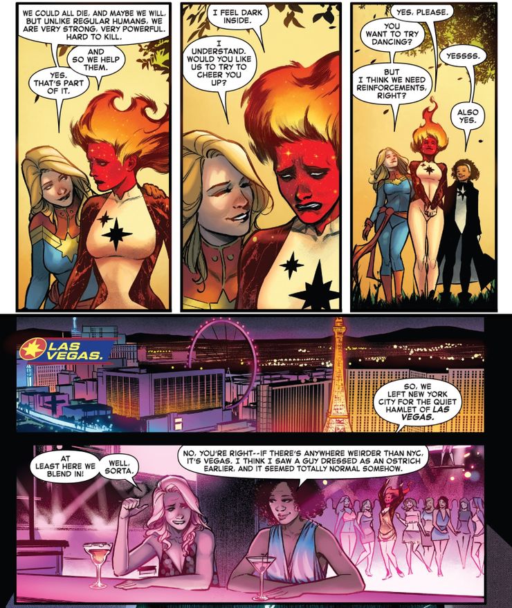 Después de Carol Danvers, su duplicado binario, y la última aventura de Monica Rambeau en Kelly Thompson y Julius Ohta’s capitana maravilla #37, los héroes necesitan relajarse. Es idea de Carol llevar al equipo a Las Vegas a una fiesta en un club, exactamente por lo que Carol regaña a Thor en el Y si…? episodio. En “¿Y si … Thor fuera hijo único?”, Llama a Carol una “aguafiestas” por querer poner fin a las festividades y enviar a los alienígenas, monstruos e invasores asgardianos lejos de la Tierra. Sin embargo, en los cómics, Carol demuestra que es todo lo contrario a una “aguafiestas”, llevando a todo su equipo a Las Vegas y uniéndose a otros personajes, como She-Hulk y Spider-Woman, en un club de baile.