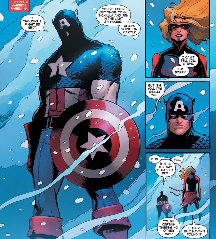 El Capitán América estaba dispuesto a morir para ayudar al Capitán Marvel a pesar de que no tenía información sobre lo que estaba sucediendo. Todo lo que el Capitán América sabía era que el Capitán Marvel estaba matando a los otros Vengadores, y su primer y único pensamiento fue cómo podría ayudarla. Es un movimiento que muestra la bondad de Steve pero, tal como ella esperaba, rompió el corazón de Carol, ya que se vio obligada a derrotar a alguien que confía plenamente en ella. Tiene sentido que la reticencia de Carol se basara más en el sentimiento que en el poder: se ha demostrado que es una luchadora despiadada a la que le encantan los desafíos e incluso estuvo dispuesta a matar a Iron Man en segunda guerra civil por lo que ella pensó que era correcto.