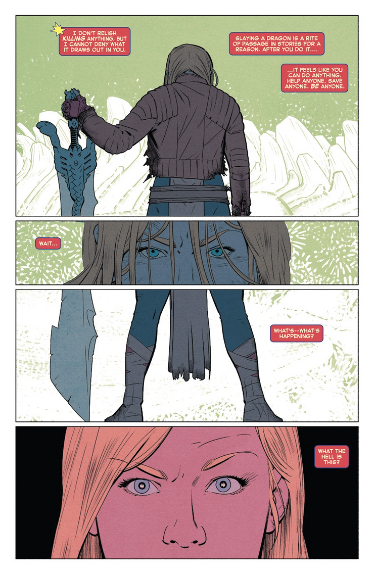 En Capitana Marvel #38, escrito por Kelly Thompson con arte de Juan Frigeri y Álvaro López, los lectores se ponen al día con la historia de Carol Danver aparentemente después de que haya pasado mucho tiempo (o nada en absoluto; este mundo podría ser ilusorio mientras que Binary continúa existiendo en el mismo período de tiempo). Danvers vive en un paisaje extraño en un mundo desconocido. Después de viajar durante días, se acerca a un enorme dragón alienígena (que amenazaba a los civiles alienígenas) y lo mata con una espada. “No me gusta matar nada, pero no puedo negar lo que provoca en ti” piensa Carol para sí misma después de que se hace la escritura.