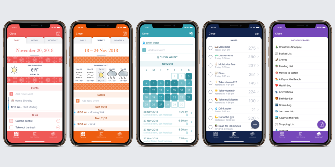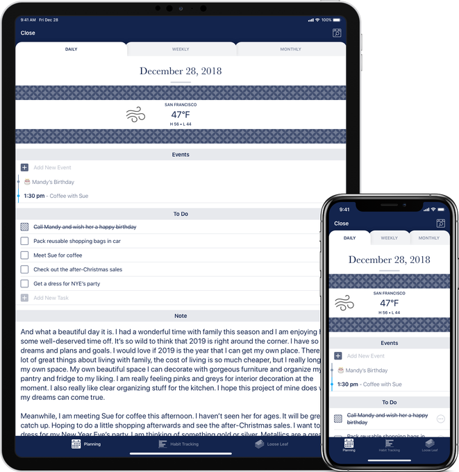 La otra pestaña principal de la aplicación es "Loose Leaf", que ofrece una página más grande que la de la sección de notas del planificador diario, para escribir entradas de diario de formato largo o cualquier otra cosa que desee recordar. Este puede ser un lugar para la escritura personal o un lugar para hacer listas que no pertenecen a un día en particular, como su lista de deseos, ideas de viaje, planes de redecoración u otros que no son "tareas pendientes" inmediatas.