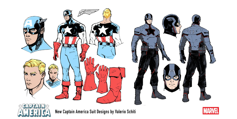 El diseño de Valerio Schiti para el nuevo traje sigiloso del Capitán América es elegante y estéticamente agradable. Los tonos oscuros del uniforme proporcionan a Steve una ventaja en las misiones encubiertas, lo que le permite colarse en los enemigos en lugar de cargarse de cabeza. Schiti rinde homenaje a los cascos de Cap a lo largo de los años incorporando el diseño alado Grabado a cada lado del casco mientras elimina las alas prominentes que sobresalen en otras versiones. Cuando se ve lado a lado, este nuevo diseño elegante contrasta con el clásico uniforme de Captain America de Schiti.