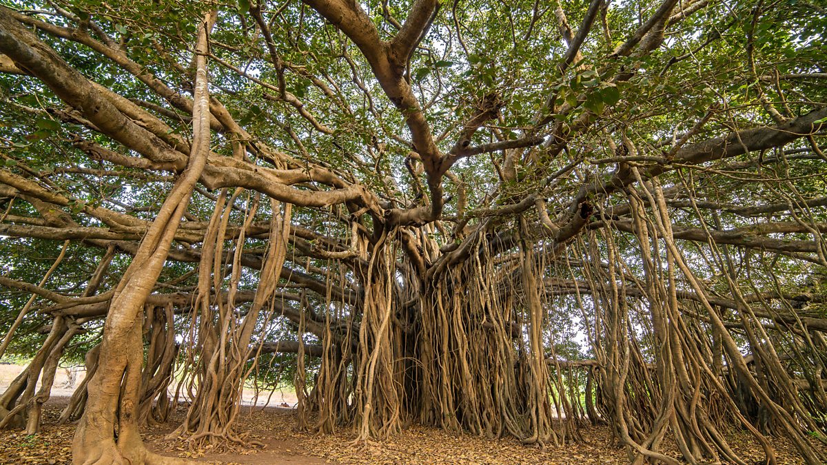 Las espectaculares raíces del Ficus Banyan recuerdan a veces a las columnas de una catedral gótica. Estas germinan en las copas de los árboles hasta alcanzar el suelo, donde actúan como soporte adicional. Todas ellas se extienden por el suelo en busca de agua, creando una estructura con forma de red.