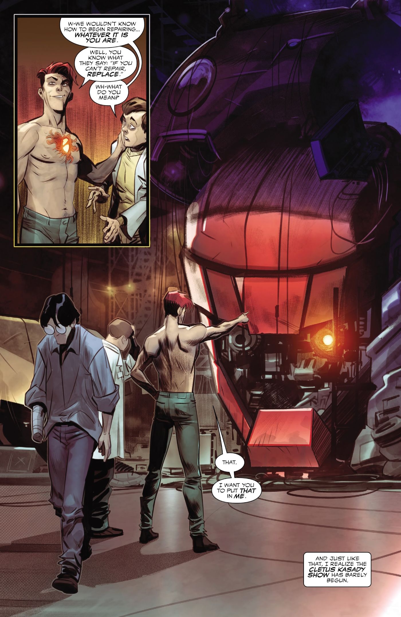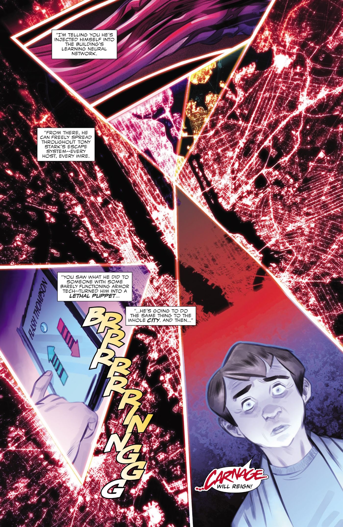 Al fusionarse con el edificio de Tony Stark, Cletus obtiene acceso a cada pieza de tecnología en Nueva York que ha fabricado la empresa de Tony. Luego puede usar una frecuencia simbionte para volver loco a cualquiera que la escuche; y con acceso directo al móvil de todos, va muy, muy mal, muy rápido. Cletus demuestra su punto de que no necesita el simbionte Carnage. Cletus se transforma esencialmente en un kaiju y causa estragos en toda Nueva York, lo que se ve amplificado por la mafia a la que ha vuelto loco para que funcione como su ejército. Todo este caos se debe enteramente a la sensación de Cletus de que Carnage lo ha eclipsado.