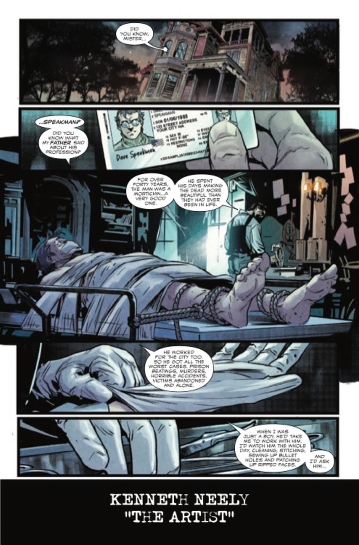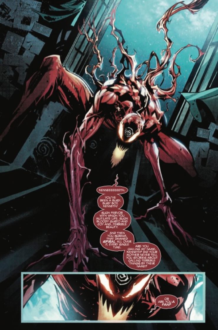 En Carnicería # 1, de David Michelinie, Ram V., Ron Lim y Francesco Manna, la historia de Carnage continúa después de que él y su antiguo anfitrión, Cletus Kasady, se separaron, dejando al simbionte a su suerte. Mientras tanto, el asesino en serie Kenneth Neely, bajo el apodo de “El artista”, quiere convertirse en el próximo presentador de Carnage. Para llamar la atención del simbionte, Neely escenificó espantosas escenas del crimen con cuerpos mutilados y la forma en espiral que ahora está sobre la cabeza de Carnage, horrorizando a las fuerzas del orden y atrayendo la atención de los medios en el proceso. Increíblemente, funcionó, y Carnage confrontó a Neely y sus intentos de llamar su atención. Neely le revela al alienígena asesino que ve a Carnage como su Dios, y sus “obras de arte” son tributos a él, prueba de que debería ser el próximo anfitrión.
