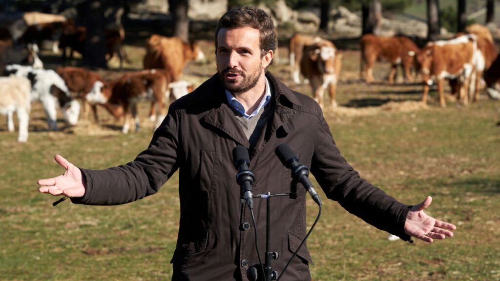 La política se construye con imágenes, como saben bien los asesores de estrategia. Así, desde que la derecha logró que explotara la polémica en torno a las palabras del ministro de Consumo, Alberto Garzón, contra las macrogranjas, los dirigentes del PP compiten por aparecer en cámara con el mejor fondo de ganado. El presidente de Andalucía, Juan Manuel Moreno Bonilla, apareció esta semana rodeado de un enorme rebaño de ovejas, y este viernes, el líder del PP, Pablo Casado, ha seguido la misma estrategia citando a los periodistas en una explotación ganadera de Las Navas del Marqués (Ávila). El jefe de la oposición ha comparecido con un idílico fondo campestre con vacas pastando a su espalda, desde donde ha cargado contra el titular de Consumo. El problema es que la granja elegida por el PP era una explotación de ganadería extensiva, precisamente las que defendió el ministro frente a las macrogranjas. Ante la contradicción entre el mensaje y la imagen, Casado ha tenido que salir al paso prometiendo que cambiará sus planes y visitará una explotación intensiva la próxima semana. En ese marco, Casado ha elevado el pistón también contra el Gobierno por el reparto de los fondos europeos. El líder popular da una vuelta de tuerca en su estrategia de cuestionamiento de la distribución de las ayudas y amenaza con denunciar ante Europa las presuntas irregularidades.