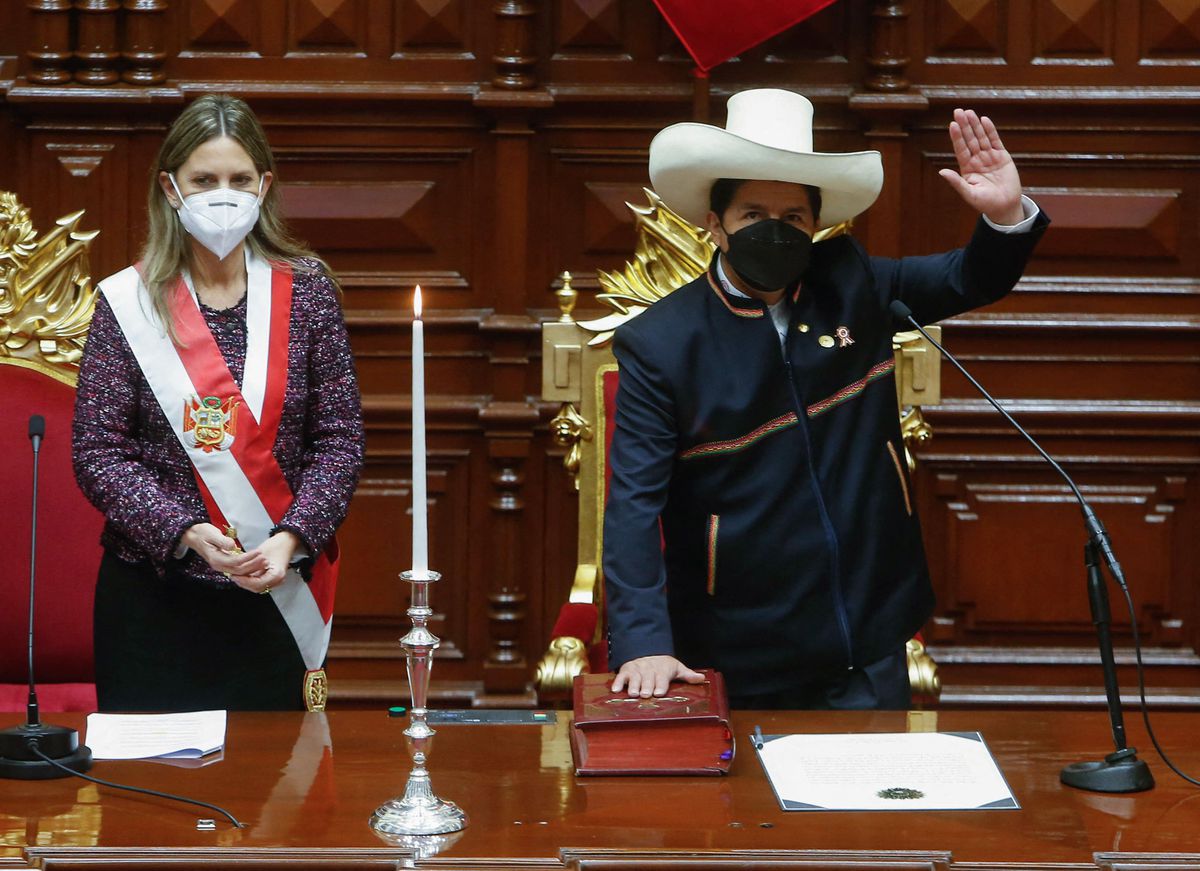 Pedro Castillo, con la mano derecha en la Biblia y la izquierda en alto, tomó este miércoles posesión como presidente de Perú. El maestro de escuela llevaba su característico sombrero de palma y una chaqueta azul sin cuello. Llegó al Congreso sin pisar la alfombra roja desplegada en la entrada en su honor. Allí se enfundó la banda presidencial el hijo de unos agricultores analfabetos que viven en un poblado remoto de los Andes. Los padres asistían al momento desde un palco. Castillo es, sin duda, el presidente más outsider de la historia del país. Cuando se presentó no tenía ninguna conexión en Lima, donde a menudo se decide el destino de la nación. El día que ganó la primera vuelta se despertó antes del amanecer y descendió descalzo una colina para ordeñar una vaca. Su llegada a la presidencia tiene un enorme poder simbólico.