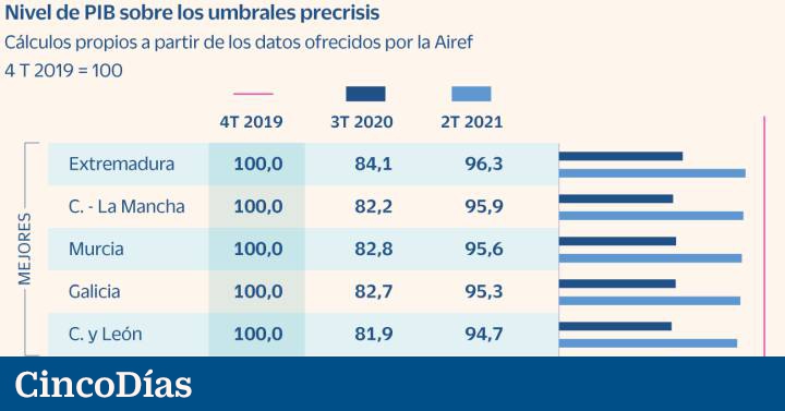 Los umbrales referidos se producen una vez incorporados los avances económicos del segundo trimestre del año, aquellos que la Airef estimó ayer. La tendencia es aquí básicamente la opuesta a la del saldo de recuperación antes referido, pues la primavera ha dado mayor margen de crecimiento a aquellas regiones ligadas al sector servicios o el turismo por el fin de las restricciones inherentes al último estado de alarma y gracias al inicio de la temporada estival. Así, dice la Airef, el mayor avance se dio en Baleares (4,1% trimestral y 25,6% anual); y Cataluña (3,3% desde marzo y 25,1% en el año). A su vez, en el vagón de cola de los avances primaverales quedan esta vez Cantabria (2,1% trimestral, 16% anual); Extremadura (2,2% en tres meses y 14,5% en el año, el peor registro interanual) y Madrid (2,2% en el trimestre y 17,6% en el año).