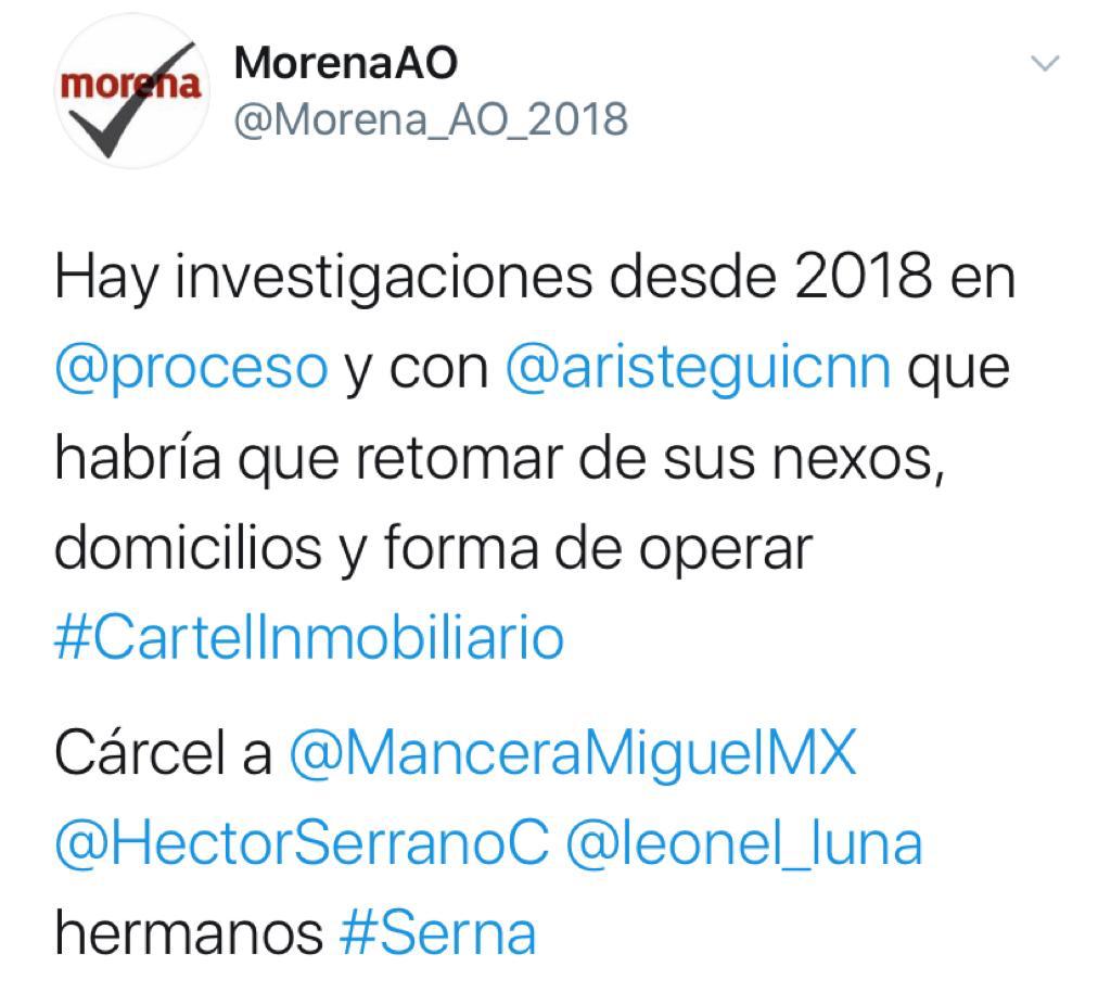 Por otra parte, un poco antes en el sexenio de Mancera, entre 2014 y mediados de 2016, la esposa de Serna, María de los Ángeles Simón Aguirre, ama de casa, se hizo de cuatro inmuebles —una donación y tres pagados al contado— con valor de 31.8 millones de pesos, como demuestran los registros de la propiedad en posesión de los autores del reportaje. Sobre eso, Serna reconoció la existencia de estas propiedades familiares y aseguró que todas están validadas. Ninguno de esos cuatro inmuebles, sin embargo, aparece en su declaración patrimonial de 2018, año en que terminó su paso por el gobierno capitalino.