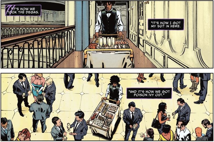En Catwoman # 31 del escritor Ram V y el artista Fernando Blanco, Selina revela todo su increíble plan con el que ya se salió con la suya. Todo comenzó con un apretón de manos con el Dr. Roy una vez que ella se infiltró en su cena en su casa, jugando a ser una socialité. El beneficio del apretón de manos provino del aceite cítrico que ella roció en su palma, lo que le permitió ver los números de código necesarios para ingresar al lugar donde estaba detenida Poison Ivy. Además, robó una de las valiosas pinturas de Roy, lo que alertó a su seguridad para que luchara y protegiera su pieza más preciada: Ivy. Si bien esto le permitió a Selina saber dónde estaba detenida en primer lugar, el verdadero golpe de gracia fue el hecho de que Catwoman tenía todo un equipo con ella que había reemplazado a los proveedores de catering de Roy, usando los carritos de comida con gran efecto.