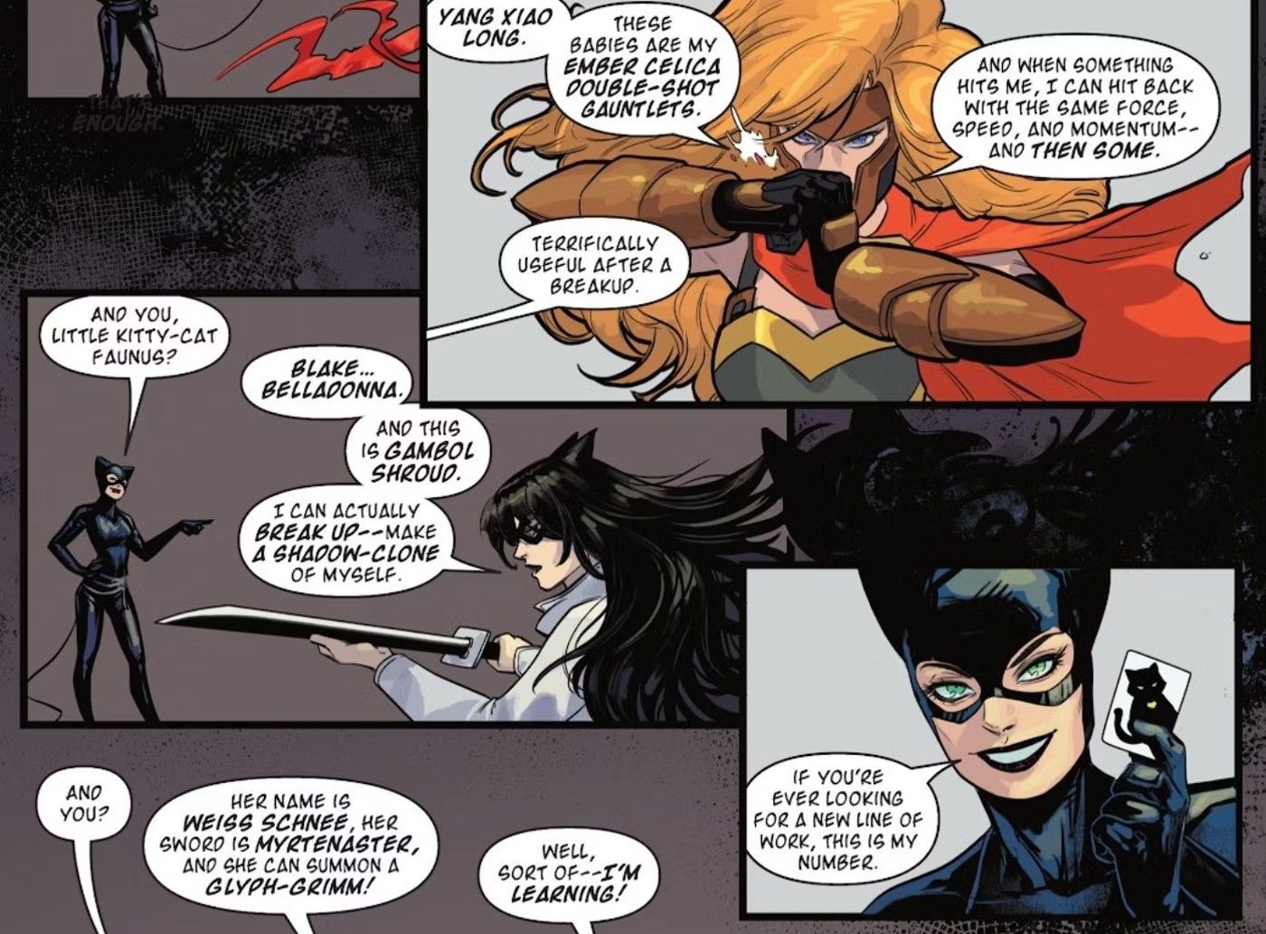 CC/RWBY #2 por Marguerite Bennett, Meghan Hetrick y Marissa Louise encuentra al Equipo RWBY presentándose a la familia de murciélagos más grande dentro de la misma Batcueva. Cuando Gatúbela hace su primera aparición no invitada en el equipo interdimensional, se enamora de inmediato del fauno felino Blake Belladonna y aún más de sus poderes. Blake se presenta a la recién llegada, revelando su habilidad para generar un clon de sombra e impresionando sumariamente a Catwoman en el proceso cuando Selina le entrega una tarjeta y le dice: “Si alguna vez estás buscando una nueva línea de trabajo, este es mi número.Curiosamente, el momento coincide con una tendencia reciente de Catwoman que expande su familia de perros callejeros.