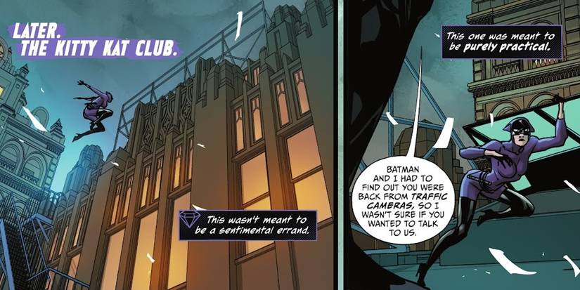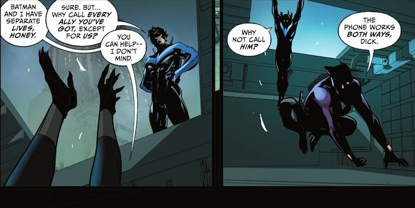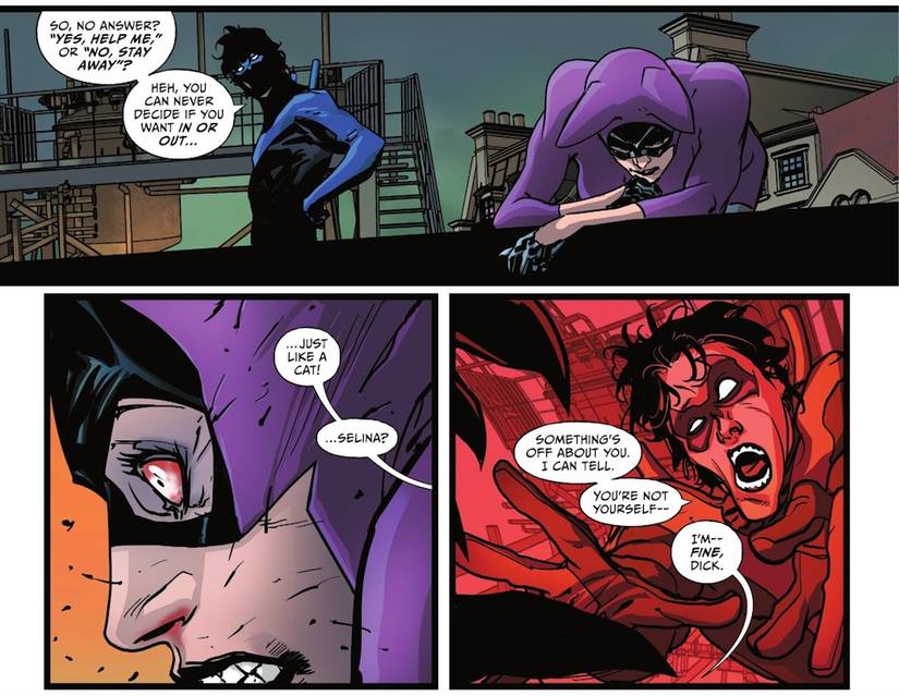 Nightwing viene a visitarla y, como intermediario, intenta reconciliar a Catwoman y Batman, informándole que tiene el respaldo de la Bat-Familia si está en problemas. Incluso el hermano de Selina Kyle, Dario, la insta a pedir su apoyo secreto. Su respuesta es simple:No. “Catwoman cree que puede manejar todo esto por sí sola.