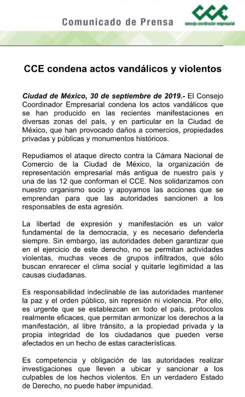 En el texto también externó que se unía a la voz de preocupación expresada por todos los organismos de representación empresarial de México, para condenar los actos de violencia y vandalismo que se han suscitado en los últimos días en distintas partes de nuestro país.
