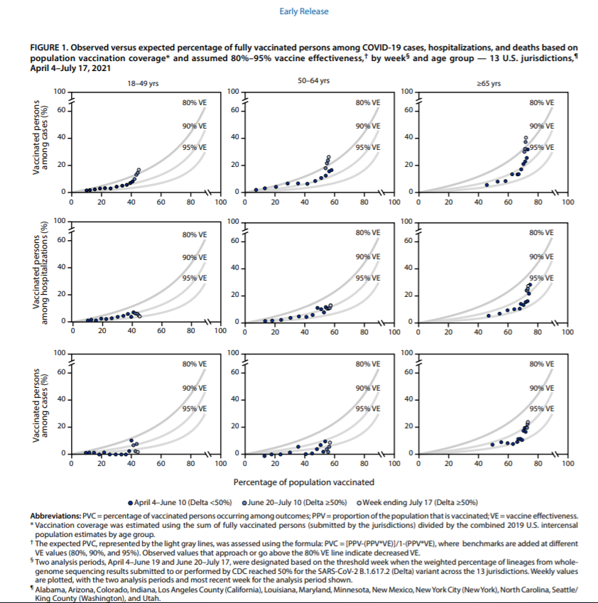 Las tasas de vacunación total en las 13 jurisdicciones estudiadas aumentaron entre los dos períodos: del 37% en el primer período, del 4 de abril al 19 de junio, al 53% en el segundo, del 20 de junio al 17 de julio. Según una investigación que presume 90% de efectividad de la vacuna, los CDC dicen que hubiera esperado que las personas vacunadas representaran el 6% de los casos nuevos, que está cerca del 5% observado, en el primer período estudiado y alrededor del 10% de los casos nuevos en el segundo, que estuvo cerca de 18%.