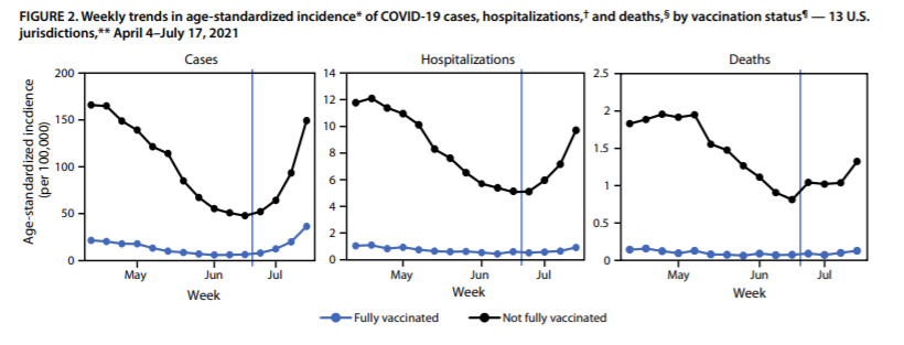 Las nuevas tasas de muertes, hospitalizaciones y casos fueron sustancialmente más altas en personas no vacunadas que en personas vacunadas en las 13 jurisdicciones de EEUU. Este último estudio de los CDC dice que sus hallazgos son consistentes con investigaciones previas que indican que la variable Delta tiene más probabilidades de causar infecciones que otras cepas, pero no es más probable, en un sentido estadísticamente significativo, que cause resultados más graves.