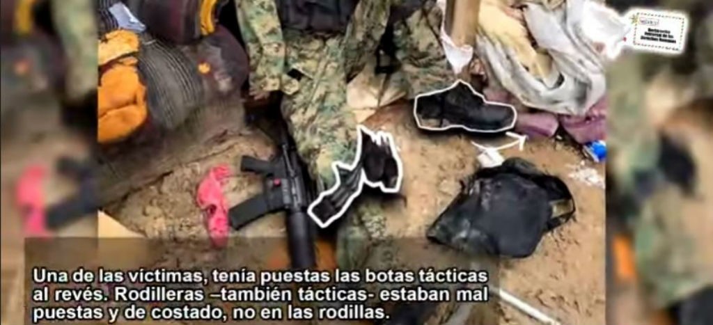 “Las víctimas estaban acomodadas dentro de la casa y en el patio. Ninguna traía un arma entre sus manos, no había cartuchos percutidos a su alrededor y tampoco impactos de bala en las paredes a su alrededor. Una de las víctimas tenía puestas las botas tácticas al revés. (Las) rodilleras, también tácticas, estaban mal puestas y de costado, no en las rodillas”, indica la organización civil.