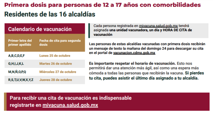 “Esto ya nos va a permitir cumplir esquemas de vacunación para todas y cada una de las alcaldías en los cinco grupos de edad de esta primera etapa del plan. Todos los adultos, el jueves 28 de octubre a las 4 de la tarde van a haber tenido oportunidad de vacunarse con el esquema completo, por lo que se tendrá una cobertura de entre el 96 a 98 por ciento del esquema completo”, subrayó.