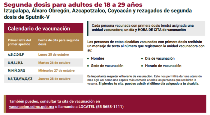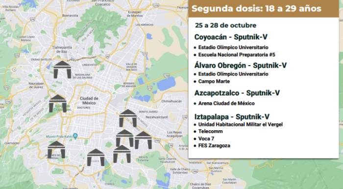 Al respecto, Eduardo Clark García Dobarganes, director General de Gobierno Digital de la Agencia Digital de Innovación Pública (ADIP), informó que del lunes 25 al jueves 28 se aplicará al segunda dosis de Sputnik V a las personas de 18 a 29 años en las alcaldías Álvaro Obregón, Azcapotzalco, Coyoacán e Iztapalapa.