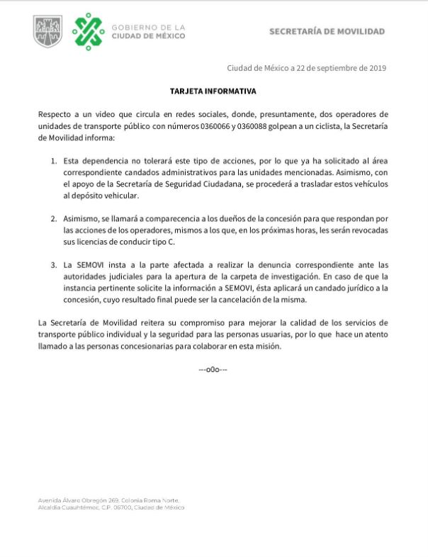 La Secretaría de Movilidad de Ciudad de México anunció que revocará las licencias de dos conductores de microbús de la Ruta 36 que agredieron a un ciclista.