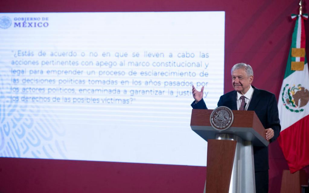 “¿Estás de acuerdo o no en que se lleven a cabo las acciones pertinentes, con apego al marco constitucional y legal, para emprender un proceso de esclarecimiento de las decisiones políticas tomadas en los años pasados por los actores políticos, encaminada a garantizar la justicia y los derechos de las posibles víctimas?”.