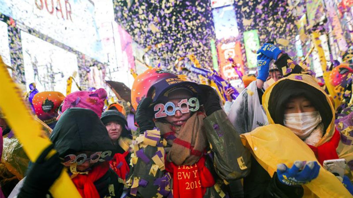 Miles de personas despidieron bajo la lluvia 2018 y dieron la bienvenida a 2019 en la emblemática plaza de Times Square de Nueva York, acompañados de una colorida nube de confeti y del descenso de la icónica bola de cristal de más de 5 toneladas.