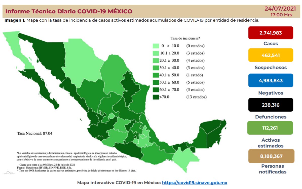 México acumula 238 mil 316 muertes por Covid-19, 362 durante la última jornada. El país tiene dos millones 741 mil 983 casos acumulados de coronavirus. En las últimas 24 horas fueron reportados 15 mil 823 nuevos casos.