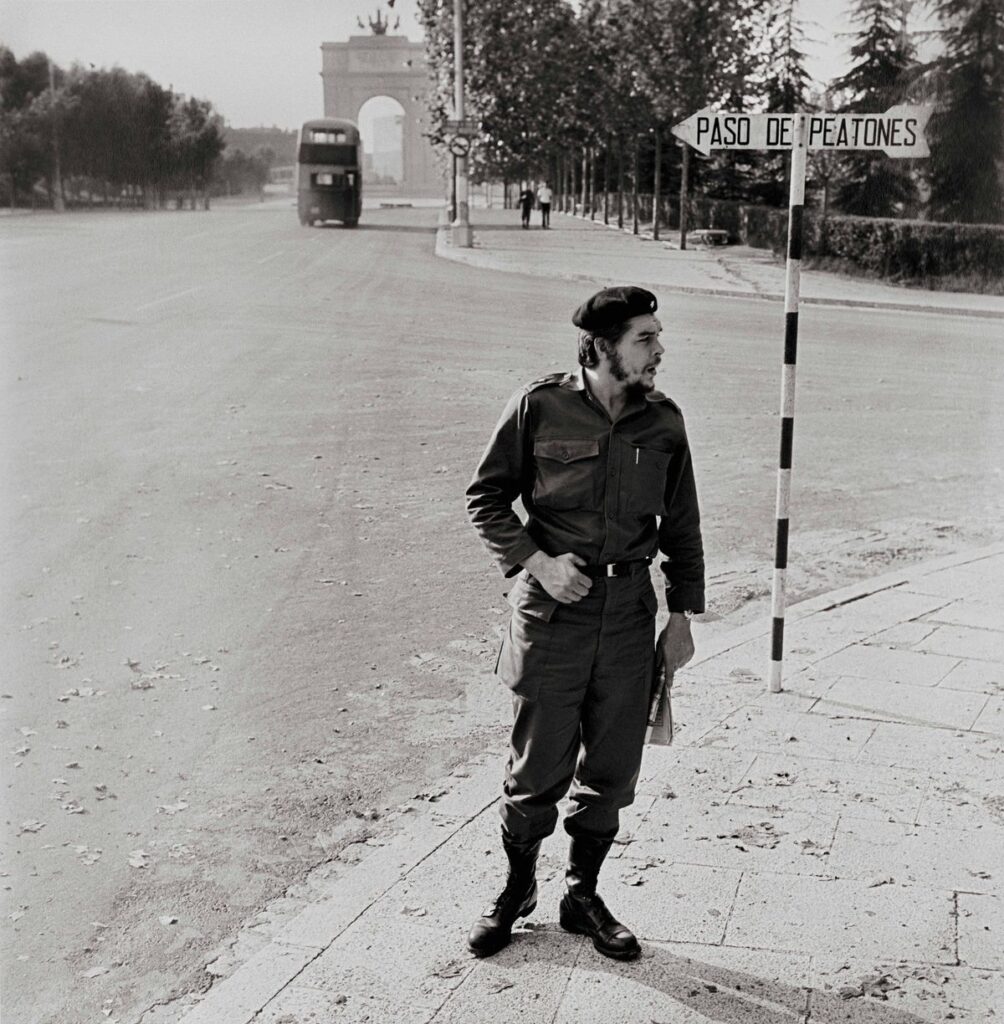 R. El periodista Antonio Olano me avisó de que el Che Guevara iba a venir a Madrid de paso y que si quería acompañarle para las fotos. Lo recibimos al pie de la escalera del avión, se fue al hotel y quedamos con él a las seis de la mañana del día siguiente. Fuimos a la Ciudad Universitaria, yo no hablaba nada, solo iba detrás para sacar aquello que indicara que estaba en Madrid. No había nadie por esa zona porque era domingo y de repente lo vi con el fondo del arco del triunfo franquista, él mirando para un lado, como perdido, y en dirección contraria, la flecha de una señal de peatones. Solo hice un disparo.