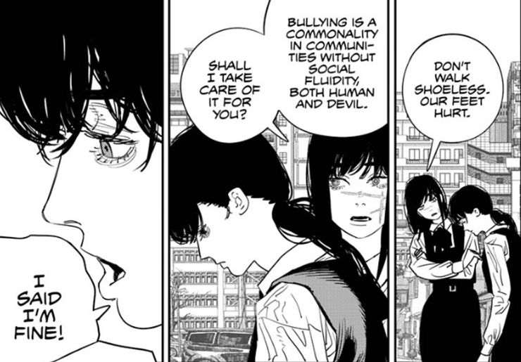 Las implicaciones detrás de cómo reacciona el diablo ante el acoso implican que ella es consciente de cómo esta forma omnipresente de acoso puede afectar negativamente a una víctima, ya que está dispuesta a impartir justicia a quienes agraviaron a Mitaka en nombre de su anfitrión. Esto demuestra empatía e incluso amabilidad. Incluso el diablo preguntando si deberían vender los zapatos de Yuko ya parece poco característico de la dinámica de su relación. War Devil siempre ha ordenado, nunca le ha pedido a Mitaka que haga algo. Y aunque vender zapatos podría potencialmente ayudar a Mitaka a servir de manera más efectiva a su anfitrión, las correlaciones no son tan claras de inmediato, creando la impresión de que el diablo está entablando una conversación aleatoria con ella además de usarla como un medio para obtener a Denji. Los lectores demasiado perspicaces se inclinan a ver estos rasgos positivos con escepticismo, ya que Fujimoto hace que sea difícil odiar a su nuevo villano cuando antes era tan sencillo. ¿Cuál podría ser la razón detrás de esto? ¿Es todo parte de un complot para hacer que el lector se apegue más al villano para provocar emociones más fuertes cuando algo inevitablemente malo le sucede? ¿O podría ser este otro tipo de situación de Makima en la que los personajes dan vibraciones conflictivas sobre sí mismos solo para lanzar a los lectores (y héroes) a un bucle mucho más grande cuando sale su verdadero lado malvado? Desde la perspectiva de Mitaka, ¿podría servir como precursor del Síndrome de Estocolmo? ¿O podría su intimidad inherente como huésped y parásito estar causando que el diablo se ablande y finalmente se redima, como una versión más intensa de la redención del Poder en Hombre motosierra después de quedar traumatizado en la primera parte?