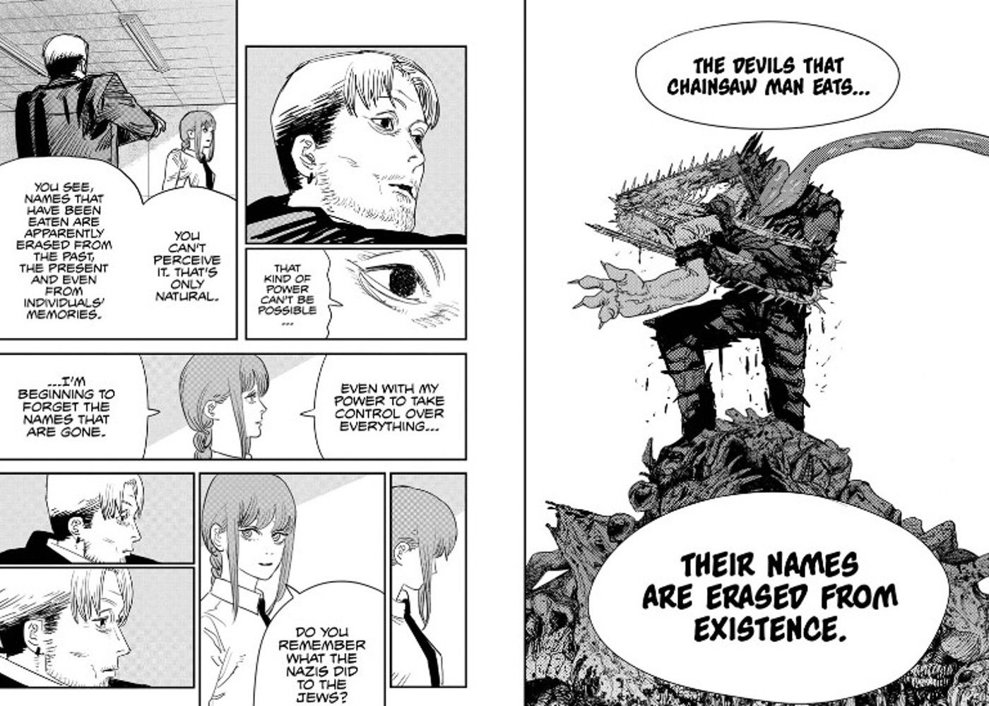 Denji comiendo Falling Devil es una gran devolución de llamada a una de las habilidades más misteriosas de Chainsaw Man. En el arco final de la Parte 1, Makima revela que cualquier Diablo que come Chainsaw Man es borrado del mundo. Makima tenía la intención de usar este poder para limpiar el mundo de sus últimos males, pero fue derrotada antes de que pudiera hacer que Chainsaw Man se comiera a los demonios. Para asegurarse de que nunca volviera, Denji se comió su cuerpo en su forma humana, lo que en realidad no borró al Control Devil del mundo, sino que borró su encarnación Makima. Esto planteó muchas preguntas, la más importante es si este borrado completo fallido fue el resultado de que Denji se comió a Makima en forma humana o si su existencia híbrida ha debilitado el poder del Demonio Motosierra.