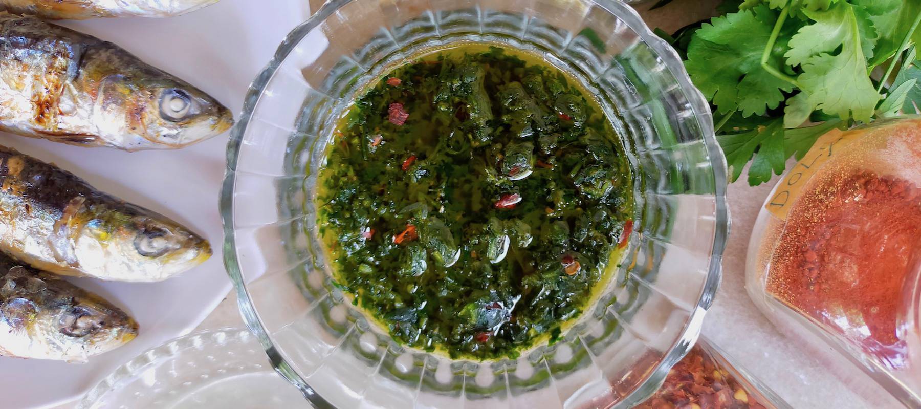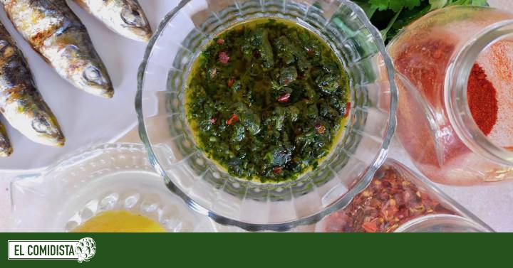 La salsa chermoula es la prima hermana magrebí de nuestro aceite con ajo y perejil. ¿La diferencia? Es más especiada y se hace con cilantro y/o perejil. Principalmente, se usa como adobo o condimento de pescados y mariscos y, en menor medida, de verduras y carnes. Con una consistencia parecida a la del chimichurri, la chermoula tiene un aspecto rojizo si abunda el pimentón, verde si predomina la hierba aromática o amarillento si se emplea mucha cúrcuma. En cuanto al sabor, obviamente depende de los ingredientes y los gustos de quien lo prepara, pero en general prevalece el toque fresco de la hierba por encima de los sabores especiados, el punzante del ajo y el ácido del limón.