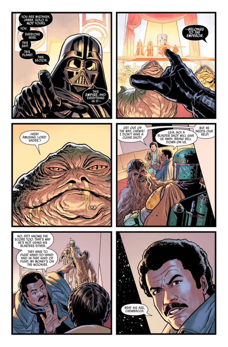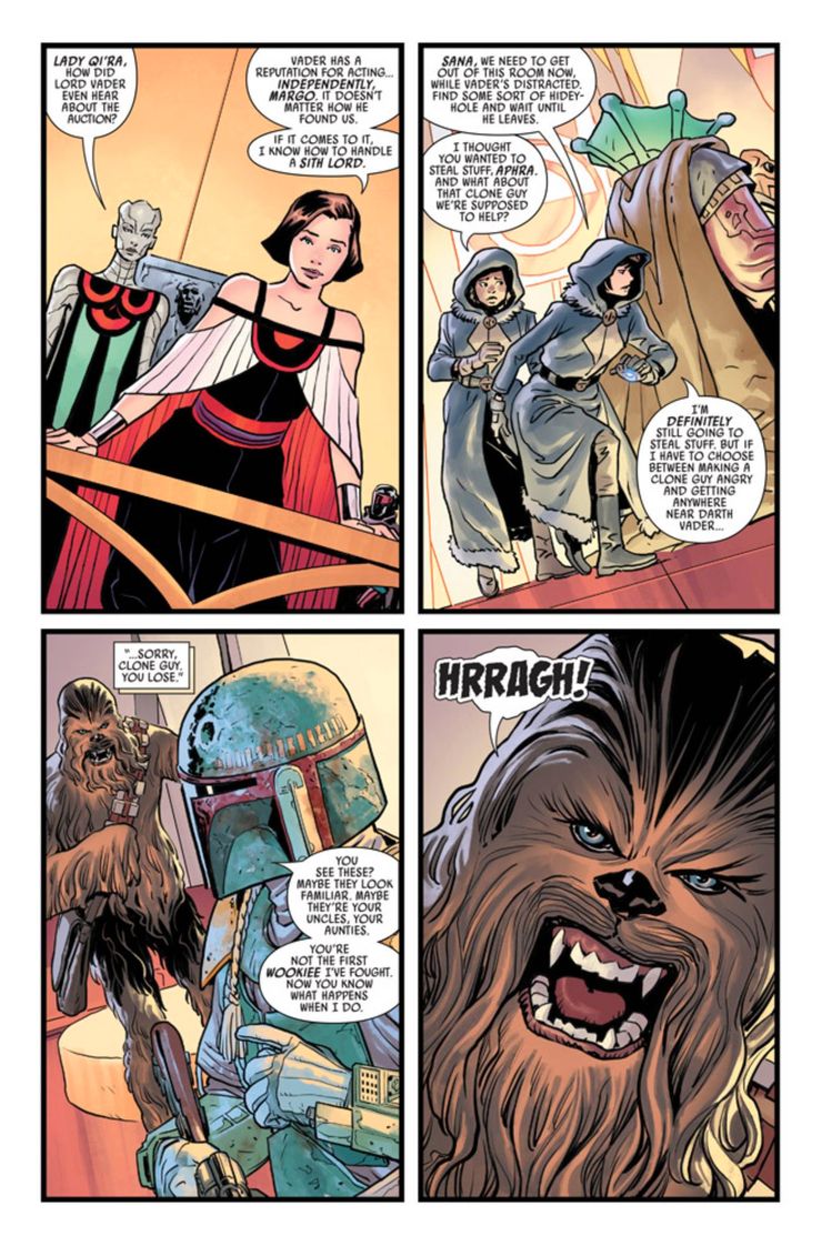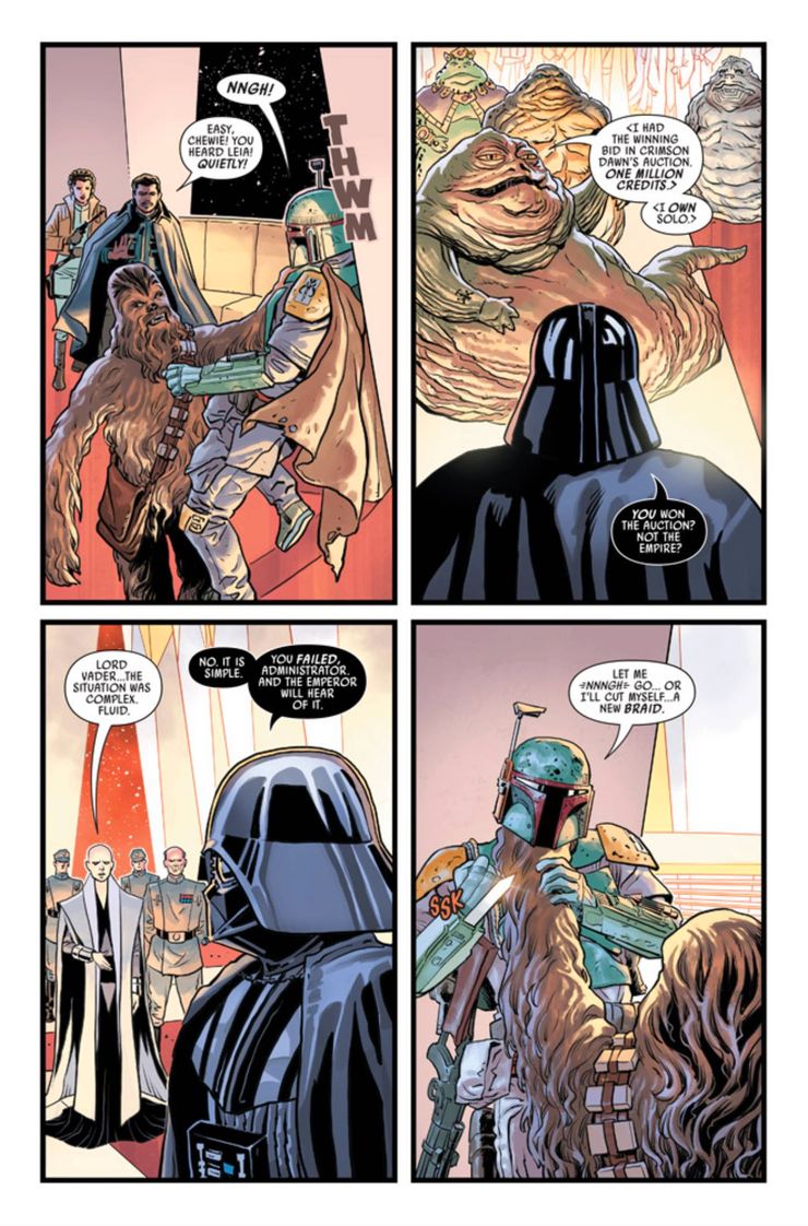 Como se reveló en StarWars.com, después de que Darth Vader colapsara la subasta de Han Solo realizada por Qi’ra, Chewbacca ve su oportunidad de vengarse de Boba Fett. Cuando Boba se refiere a Han como “una cosa”, es suficiente para que Leia y Chewie se pongan agresivos. Antes Ataques de Chewbacca, el cazarrecompensas revela que ha peleado con otros Wookies antes y ha ganado, llevándose sus trenzas como premio. “¿Ves estos? Quizás te parezcan familiares. Quizás sean tus tíos, tus tías. No eres el primer wookie con el que peleé. Ahora sabes lo que pasa cuando lo hago “. Chewie gruñe y procede a estrangular a Boba Fett, apagando la motivación adicional que involuntariamente le dio.