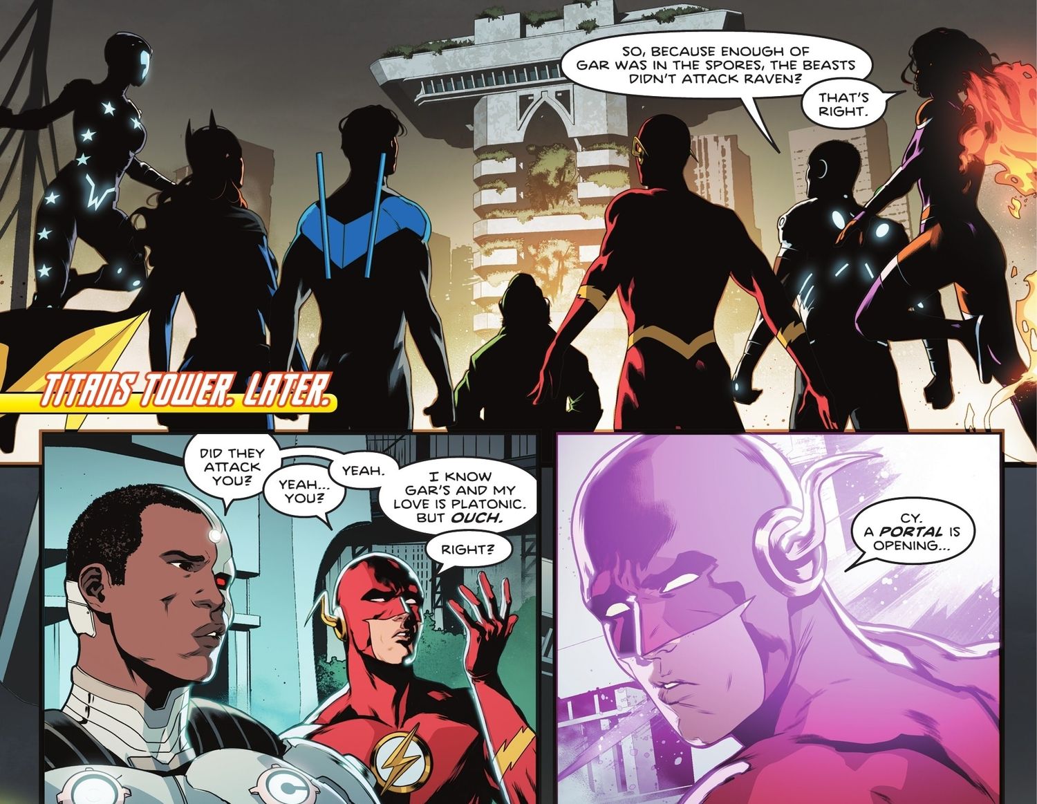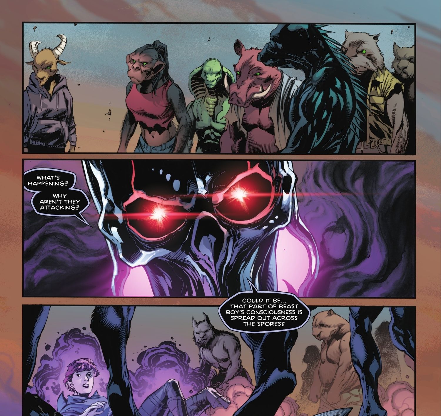 Después de darse cuenta de que una parte de Gar todavía está viva, Raven se comunica telepáticamente con todos los héroes, instándolos a dejar de matar las esporas y centrarse en la contención. Esta inesperada manifestación de la conciencia de Chico Bestia resalta la naturaleza profunda y duradera de su amor por Raven. A pesar de perder todos los demás aspectos de sí mismo, su amor por ella sigue siendo el único superviviente. Este amor no sólo protege a Raven de los ataques de las criaturas infectadas, sino que también le da lo que necesita para salvarlo: la confirmación de que aún se puede salvar.