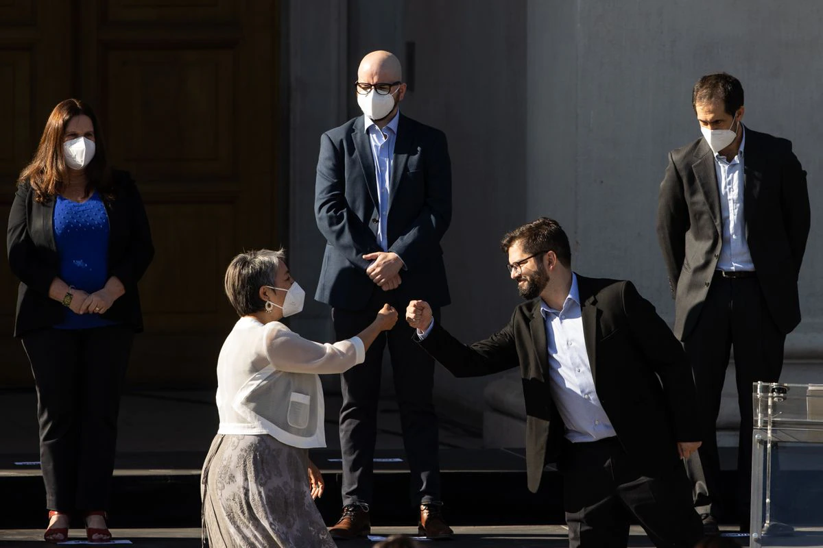 Su Gobierno reedita la combinación de elementos que le permitieron la victoria. Con una media de edad de 49 años, hay nombramientos de alto valor simbólico, dosis de pragmatismo político y líneas transversales claramente definidas, como el feminismo. En su equipo ha reunido a 14 mujeres y 10 hombres, y en él figuran ocho independientes, pero también compañeros de viaje con los que Boric protestó en las calles y forjó su carrera parlamentaria. Entre ellos destacan Camila Vallejo y Giorgio Jackson, así como la carismática Izkia Siches, una figura clave en la segunda vuelta de las elecciones, que será la primera mujer en ocupar el Ministerio del Interior. La designación de mayor impacto ha sido la del actual presidente del Banco Central, el socialdemócrata Mario Marcel, como ministro de Hacienda. La elección de este respetado economista, con experiencia en gobiernos de centroizquierda, no solo lanza un mensaje de tranquilidad a los mercados, sino que subraya la voluntad del presidente electo de contar con las fuerzas progresistas clásicas y de formar un Ejecutivo capaz de suplir las carencias de su propia coalición electoral. Dos nombres de alta carga simbólica son la ministra de Defensa, Maya Fernández, nieta del expresidente Salvador Allende, y Antonia Urrejola en la cartera de Exteriores. Con Urrejola, expresidenta de la Comisión Interamericana de Derechos Humanos, el próximo mandatario chileno deja clara la distancia de su Gobierno hacia autoritarismos que azotan Latinoamérica, incluido el de Daniel Ortega en Nicaragua, con quien la futura ministra se ha mostrado muy crítica.