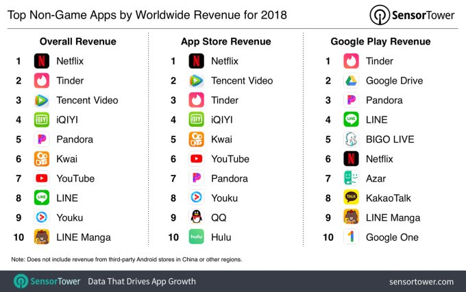 Otras aplicaciones chinas también llegaron a los gráficos de fin de año, incluida la plataforma de video en línea iQIYI, que fue la aplicación número 4 que no es de juegos, en términos de ingresos generales; y TikTok de ByteDance, que fue el número 4 que no fue juego para 2018. Otras aplicaciones de alto rango incluyen UC Browser, QQ, Youku y PUBG Mobile de Tencent.
