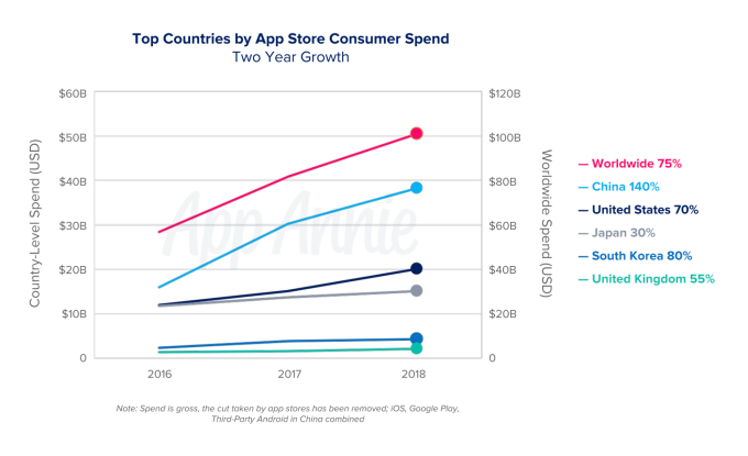 Las descargas de aplicaciones globales superaron los 194 mil millones en 2018, un 35 por ciento más que en 2016, según el informe anual "Estado de móvil 2019" de App Annie publicado hoy. El gasto del consumidor en las tiendas de aplicaciones aumentó un 75 por ciento para alcanzar los $ 101 mil millones. El informe, que analiza las tendencias en las tiendas iOS, Android y de terceros en China combinadas, sigue el informe anterior de la compañía publicado al final del año, que analiza las descargas y el gasto solo en iOS y Google Play.