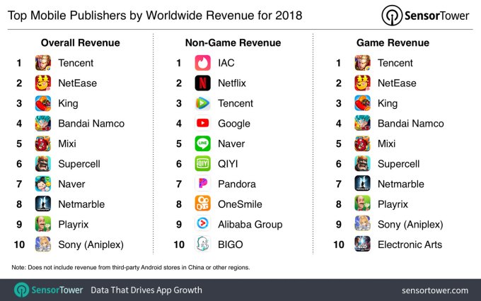 Descubrió que el gigante chino de juegos móviles Tencent era el líder mundial en ingresos globales en iOS y Android, sin contar las tiendas de aplicaciones de Android de terceros. También fue el líder en ingresos por juego.