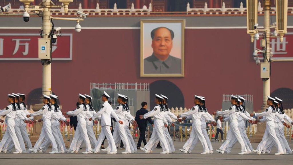 Carteles rojos en las avenidas cercanas a la plaza de Tiananmen, que será el corazón de las celebraciones, animan en grandes letras blancas a festejar el aniversario “con el Partido Comunista y el camarada Xi Jinping (el presidente chino) en su centro”.