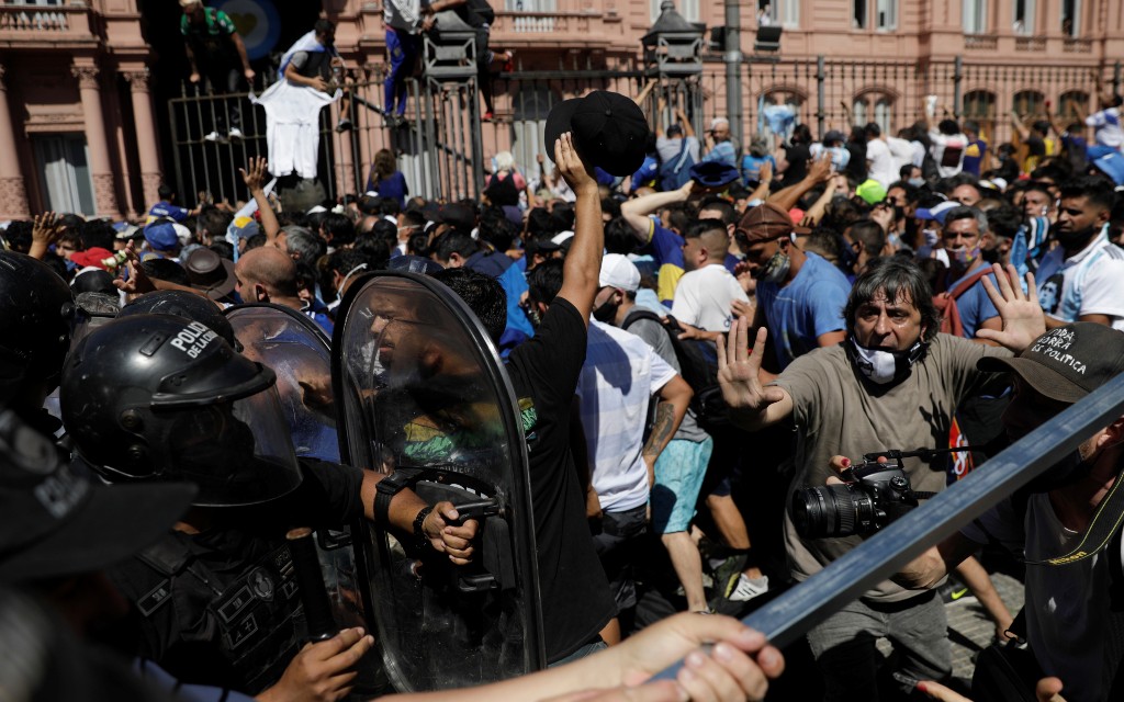 El velatorio de Diego Armando Maradona vive este jueves momentos de tensión por el enfrentamiento entre policías y aficionados, cientos de seguidores del ‘Diez’, que se agolpan alrededor de la Casa Rosada para entrar a despedir al mito fallecido a los 60 años de edad.