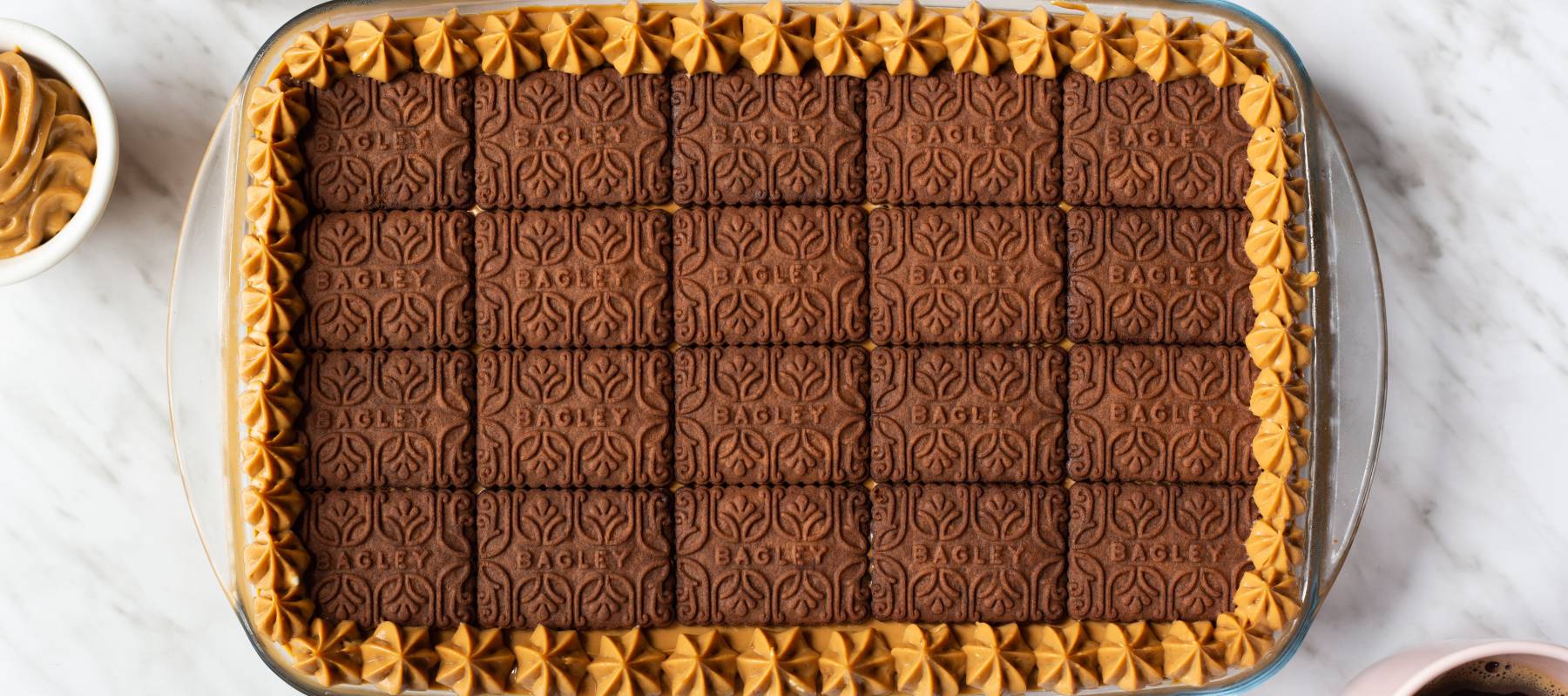 La receta original de Mabragaña indicaba embeber las galletas en Oporto y utilizar para la mezcla de relleno partes iguales de dulce de leche y Mendicrim. Como toda receta, se ha ido adaptando a las particularidades de cada hogar y es común ver que se intercambie el Oporto por leche, leche con cacao, café o café con un poquito de licor. En esta receta en concreto, hemos optado por el café pero puedes intercambiarlo por cualquiera de las otras opciones. Respecto al queso, cabe decir que en España no existe algo similar al Mendicrim, por lo que tenemos que utilizar uno más consistente estilo Philadelphia. El batido es algo más costoso pero no varía significativamente en cuanto a sabor, aunque también es válido rebajarlo con un poco de leche, nata o mascarpone.