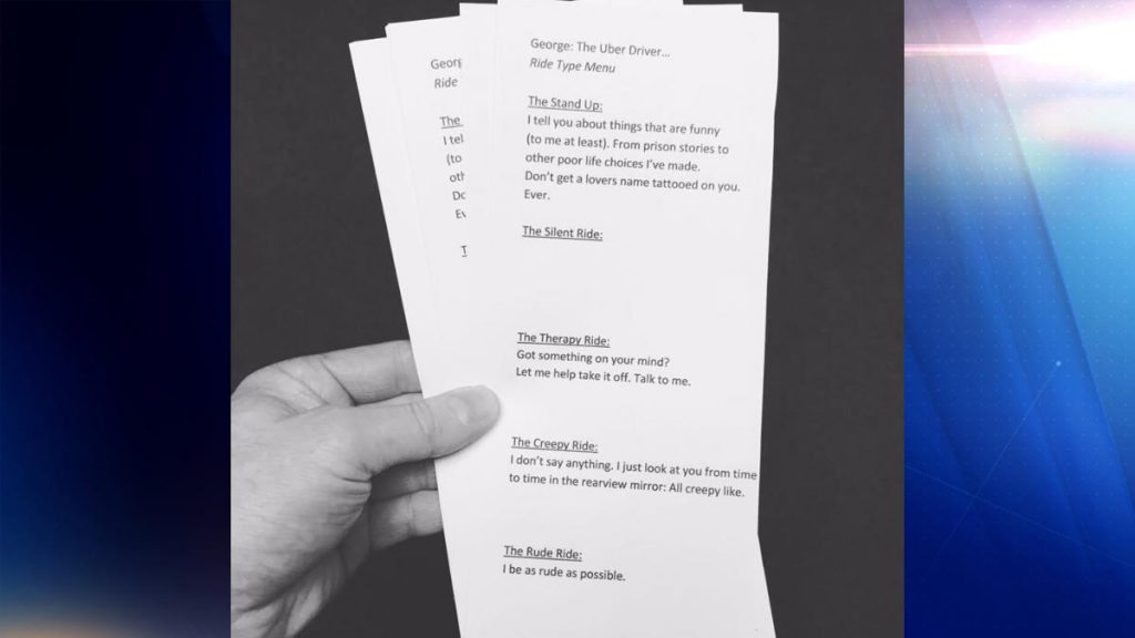 Se trataba de los distintos tipos de actitud que el conductor adoptaría de acuerdo a la preferencia del pasajero. Empezando por el llamado “The Stand Up”, una especie de monólogo en el que el conductor llamado George Ure, contaría cosas graciosas “al menos para mi” con anécdotas de su “paso por prisión y otras malas decisiones que he tomado”, según explica el papel. “Nunca te tatúes el nombre de una ex, Nunca”, agrega la nota.