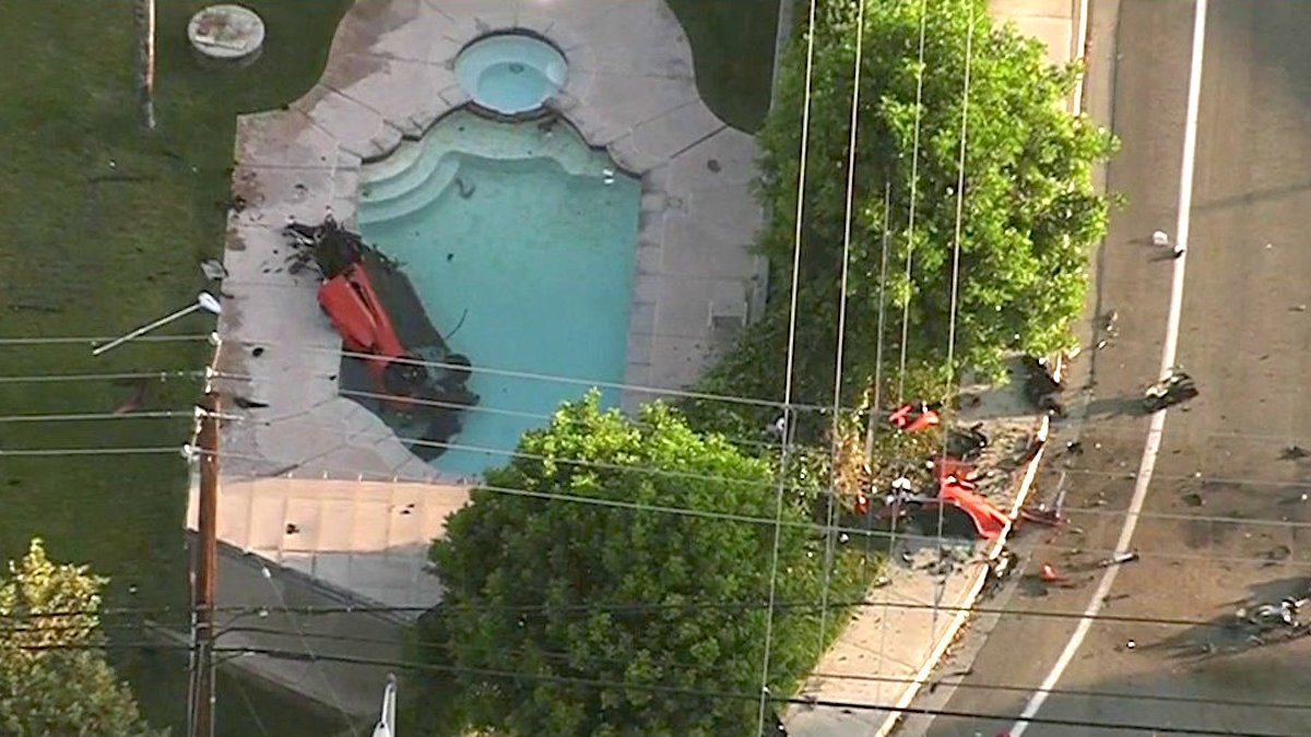 Las autoridades indicaron que el conductor no pudo girar debido a la velocidad excesiva, lo que provocó que el vehículo chocara contra una acera elevada, saltara por el aire y pasara por encima de la cerca del patio trasero que bordeaba una casa antes de aterrizar en una piscina.