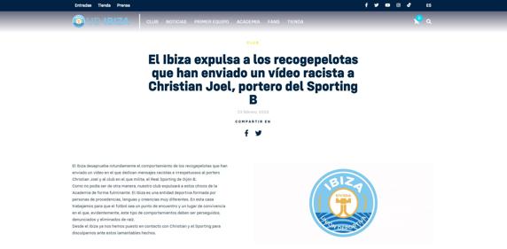 “El Ibiza desaprueba rotundamente el comportamiento de los recogepelotas que han enviado un vídeo en el que dedican mensajes racistas e irrespetuosos al portero Christian Joel y al club en el que milita, el Real Sporting de Gijón B.