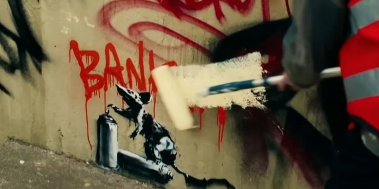 Su arte apareció por primera vez en Bristol… así que alguien dijo: ‘¿Qué pasa si tratamos de contactar al verdadero Banksy y hacemos que haga una obra de arte para el espectáculo? Y luego le pediremos a Christopher Walken que pinte encima. Nos las arreglamos para encontrar algunos intermediarios, y le avisamos a Banksy, y él dijo: ‘Si tengo tiempo, haré esto’. Así que nos presentamos una mañana, solo yo y algunos otros, y había un Banksy original pintado en este edificio que estábamos usando como escenario. Lo cubrimos, lo escondimos del elenco, del equipo, unas seis semanas después fui al tráiler de Christopher y dije: ‘Hemos tenido un Banksy original aquí durante seis semanas, vamos a pintar sobre él esta mañana, y lo vas a hacer’. Nadie lo sabe, y tuvimos como una oportunidad para hacerlo bien, y lo conseguimos, y lo incluimos en el programa.