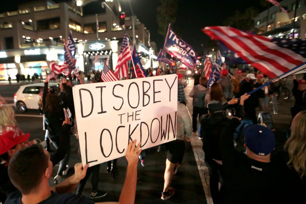 “Desobedezcan el toque de queda”, “saquen a Gavin Newsom” y “el coronavirus es un fraude”, fueron algunas de las arengas que repitieron los manifestantes, en su mayoría simpatizantes del presidente Donald Trump y opositores del toque de queda que regirá hasta el próximo 21 de diciembre.