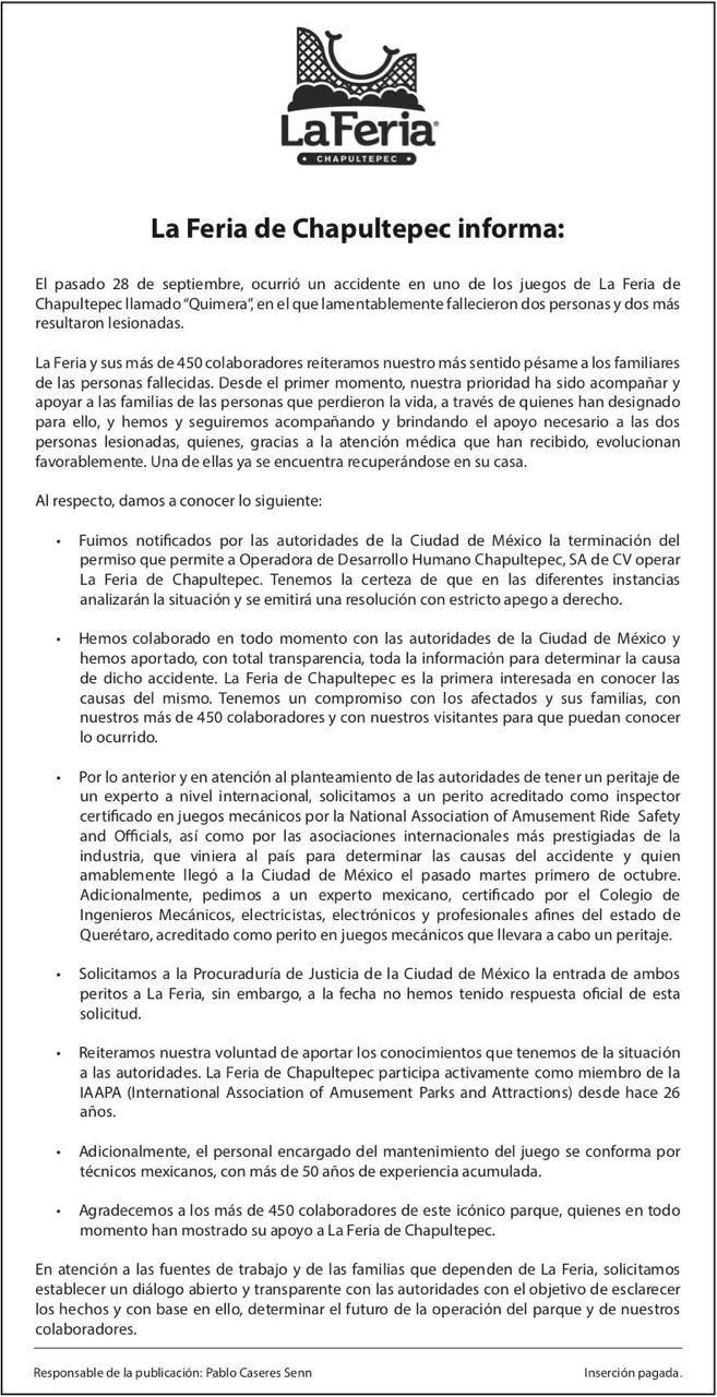 La Feria de Chapultepec informó este domingo que le fue revocado el permiso de funcionamiento, luego del accidente que el pasado 28 de septiembre causó la muerte de dos personas.