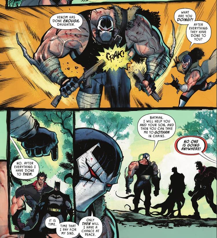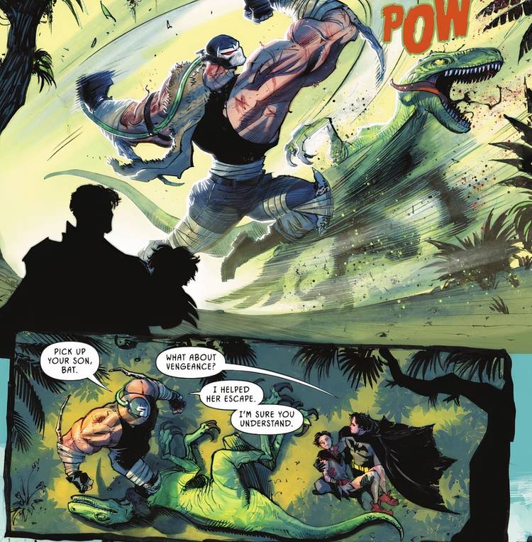 Bane se rindió y luchó junto a Batman y Robin, lo que fue solo el preludio de su verdadero cambio de actitud. Hacia el final del número, mientras Bruce acuna a Damian, que se está recuperando de la inyección de Venom que Vengeance le impuso en el número 12, el dúo es tomado por sorpresa cuando un raptor salta repentinamente de los arbustos, listo para atacar. Habría sido un encuentro fatal, ya que Batman y Robin estaban sentados en el suelo, sin darse cuenta del peligro. Sin embargo, Bane interviene, lucha contra la criatura y les salva la vida..
