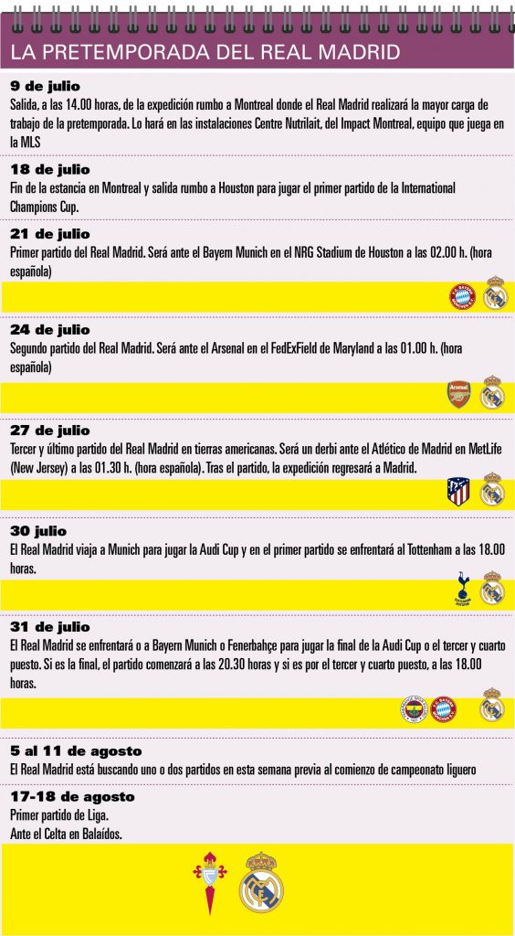 El equipo merengue debutará en la International Champions Cup contra el Bayern (21 julio, 2.00 h española) en el NRG Stadium (Houston). Tres días después (24 julio, 1.00 h española), los de Zizou se medirán al Arsenal de Unai Emery en el FedExField, Landover (Maryland). Y el choque estelar será el derbi contra el Atlético de Simeone (27 julio, 1.30 h española) en el MetLife, East Rutherford (New Jersey).