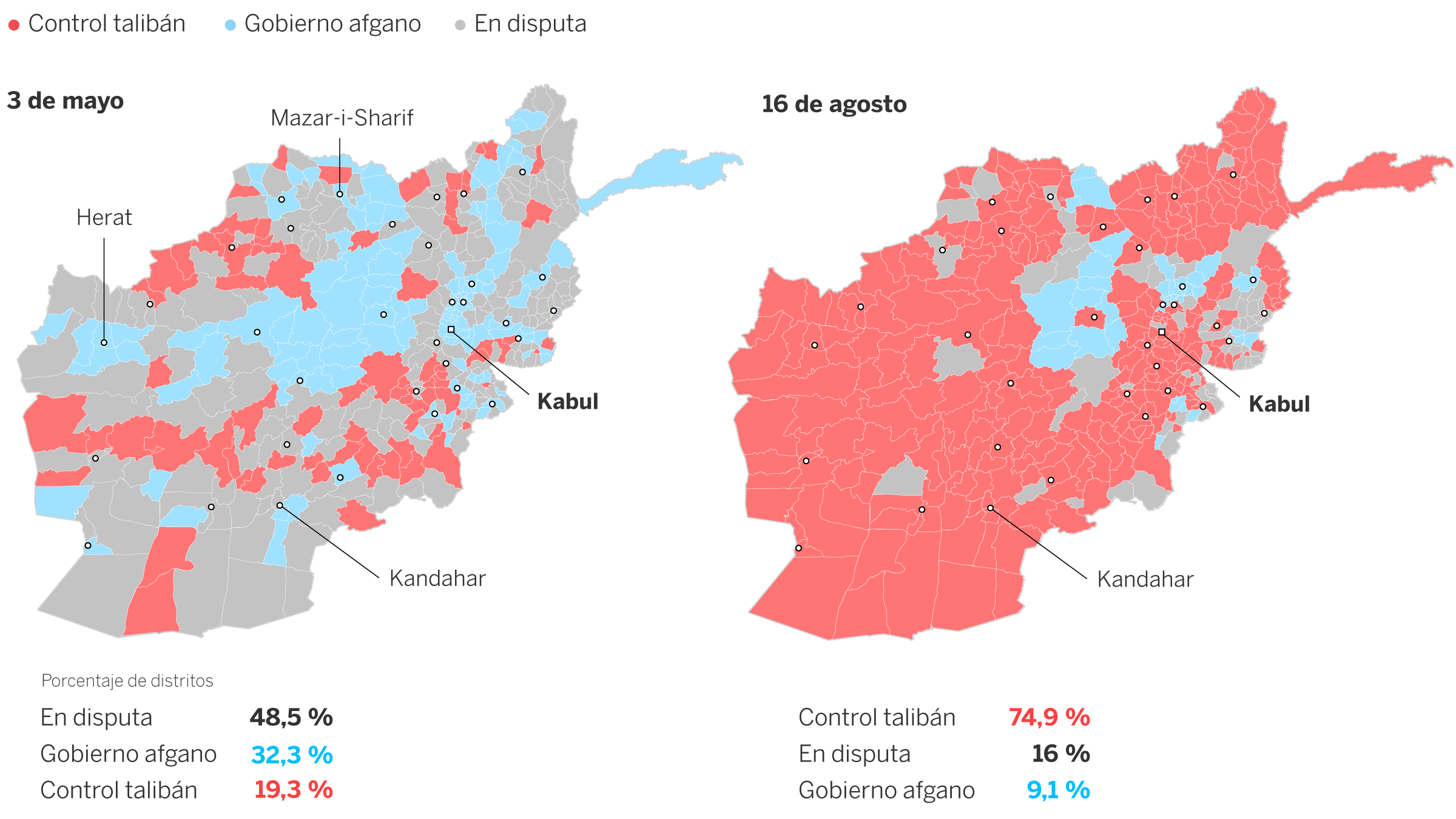 Una vez que Estados Unidos comenzó su repliegue, que se prevé que finalice el 11 de septiembre, los talibanes, con presencia en diferentes zonas del país, especialmente en el sur, se concentraron en avanzar hacia los distritos más rurales, con menor defensa por parte del Gobierno afgano y local. El 3 de mayo, el Gobierno mantenía las capitales de las 34 provincias en las que está dividido Afganistán.