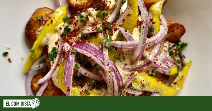- Servir las patatas con la salsa encima, un toque de pimienta, si se quiere, más gochugaru, las piparras y la cebolla morada cortada muy fina.