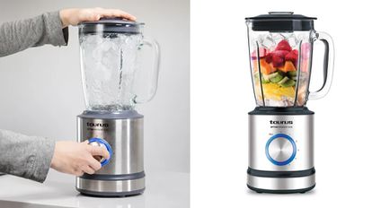 También podemos decantarnos por una batidora de la gama profesional de Taurus, como la de la imagen. Su motor es de alto rendimiento (alcanza los 1.500 vatios) y sus seis cuchillas de acero inoxidable pueden moverse a 30.000 revoluciones por minuto. Dispone de tapón con bloqueo en la tapa, boca de vertido en la jarra, selector de velocidad variable y pies antideslizantes. Incluye accesorio empujador y recoge cables.