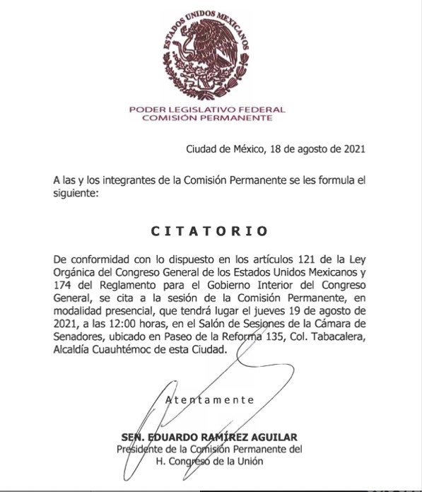 El presidente de la Mesa Directiva de la Comisión Permanente del Congreso de la Unión, Eduardo Ramírez, citó a los legisladores este jueves para discutir, y en su caso aprobar, un periodo extraordinario para este viernes 20 de agosto con el fin de avanzar en la aprobación de la Ley Federal de Revocación de Mandato, la Ley Federal de Juicio Político y Declaración de Procedencia, así como la Ley Orgánica de la Armada de México.